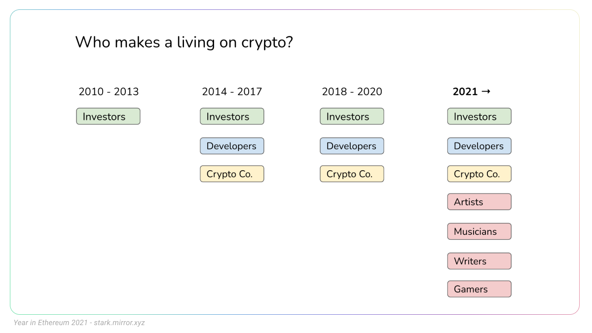 This year, a much greater number of people from new and very different professional backgrounds began using Ethereum to support themselves financially. In 2021, people can earn money using Ethereum without any pre-existing capital, without technical skills, without a background in finance or investing, and without a job at a crypto startup.